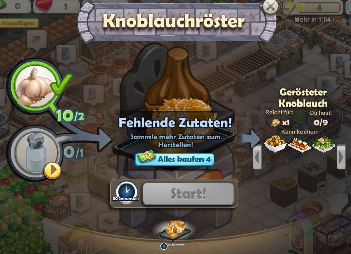 Die Knoblauchbude steht euch im Spiel recht früh schon zur Verfügung obwohl ihr den Knoblauch erst bei späteren Gerichten öfter braucht. Für den gerösteten Knoblauch müssen zwei Knoblauchknollen und mal wieder ein kompletter Salzstreuer verwendet werden. Ein Priese Salz reicht nicht.