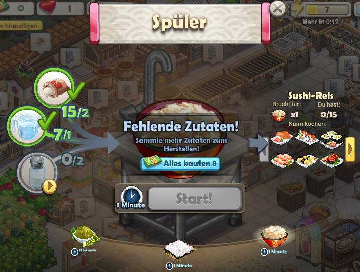 ChefVille Sushi-Reis ensteht in dem Küchengerät, das sich „Spüler“ nennt, durch zwei Päckchen Rundkornreis, einen Liter Wasser und zwei volle Salzstreuer!