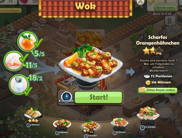 Für die Herstellung des Scharfen Orangenhähnchens sind dann fünf Orangen notwendig, bis der Wok anfängt zu garen. Wenn ihr dann schnell mit diesem Gericht euer erstes Meistersternchen einsammeln wollt, dann merkt ihr, dass dies wieder ziemlich lange dauern kann.