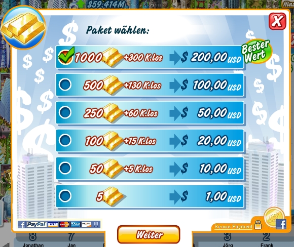 Aber wie es eben bei Millionaire City so ist, kannst Du dieses attraktive Haus nur durch die Einsatz von Goldbarren erwerben. Üblicherweise musst Du dazu 70 Barren aus Deinem Tresor auf den Tisch des Verkäufers schleppen. Diese Goldbarren könnte man gegen echtes Geld kaufen. Die Preisliste zeigt mehrer Staffelpreise und „empfiehlt“ Dir, mit dem Einsatz von $200,00 (EUR 160,00), den „besten Wert“ zu nutzen.