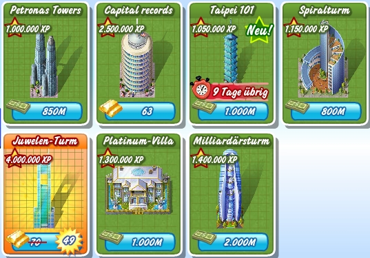 In der Zwischenzeit kannst Du emsig Spielgeld-Dollar sammeln und zum Listenpreis von 2 Billionen (2.000.000.000) ab Level 145 Milliardärstürme kaufen (Baufläche 2×3, 120 Einwohner).