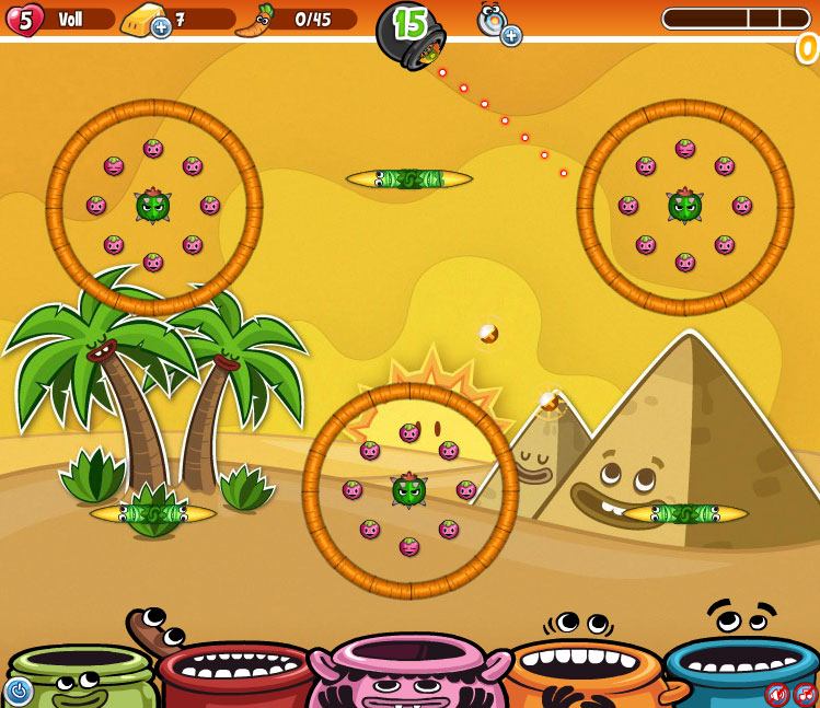 Es gilt wieder einmal Kübel einzufärben in dieser Runde, wobei zwei davon mit einem Deckel verschlossen sind. Ihr habt nur 15 Birnen zur Verfügung, was ziemlich wenig ist. Außerdem stören ein paar Kakteen die Wüsten-Idylle. Zum Glück habt ihr von Beginn an einen Feuerball im Spielfeld, mit dem ihr vielleicht einen Kaktus unschädlich machen könnt. Wenn ihr einige Birnen an die Kakteen verliert, habt ihr eigentlich schon das Level verloren. Dann reichen die Birnen schlicht nicht aus, um alle Töpfe zu öffnen und einzufärben. Nehmt euch also in acht und zielt ganz genau.