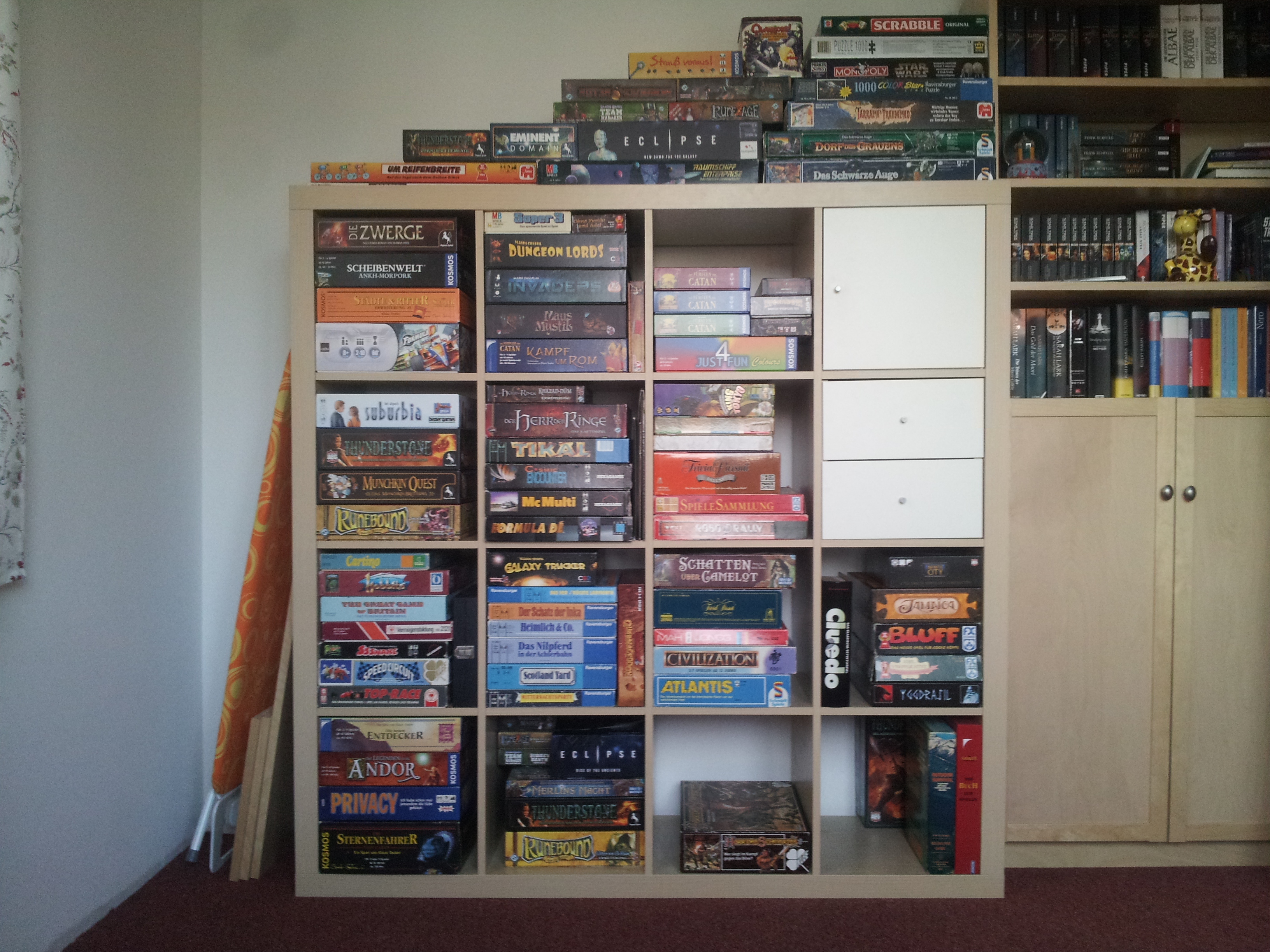Habe mal ein Foto meines aktuellen Spieleregals angehängt, damit Ihr mich ein wenig enschätzen könnt.