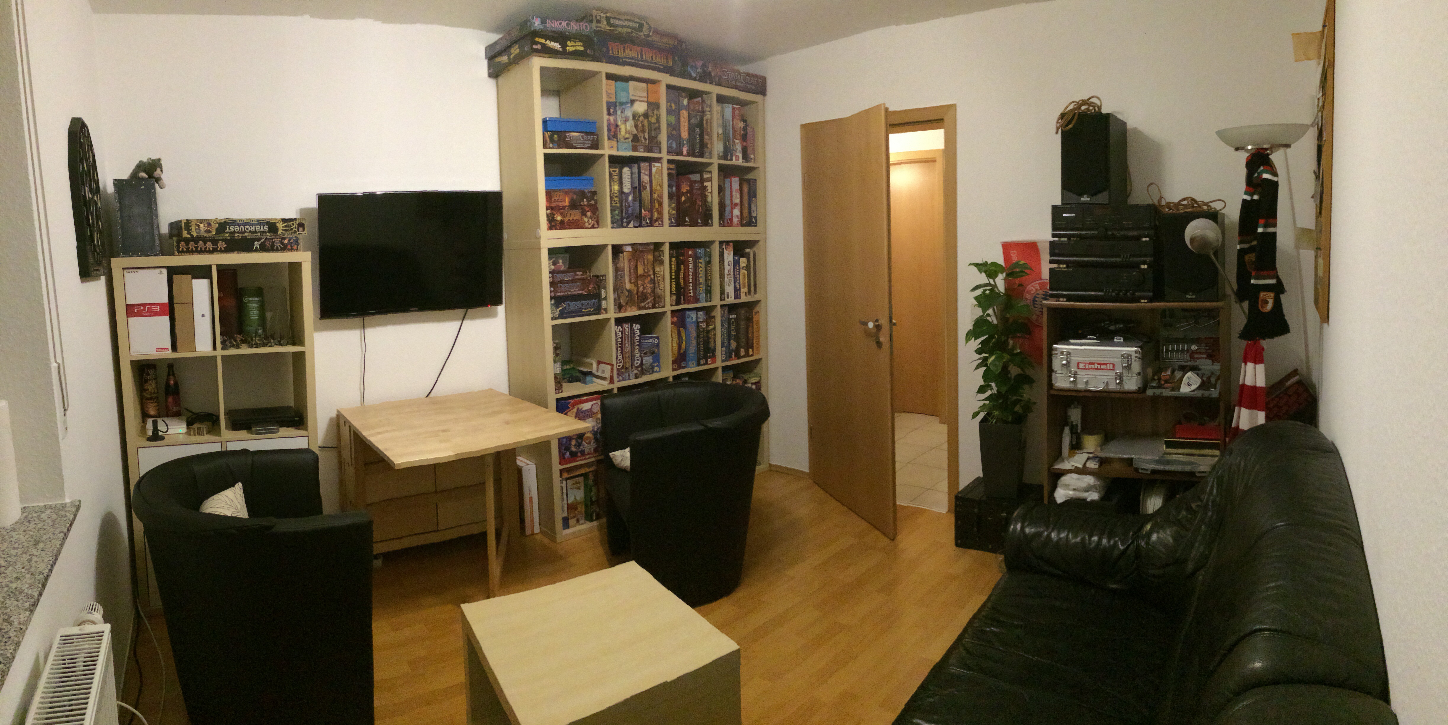 - Rechts neben dem TV stehen insgesamt 3 Kallax-Regale (eins liegt oben quer) mit all meinen Spielen die ich besitze (Dank an alle die mir geholfen haben das Regal in letzter Zeit etwas weiter zu füllen!) Hier dient die linke Spalte als Ablage für momentan gespielte Spiele, Spiele mit Sortierboxen oder oft benötigtes Spielmaterial (Kartenhalter, Würfel, Untersetzer fürs Bier etc) - immer alles griffbereit :)