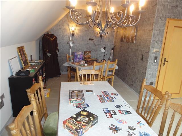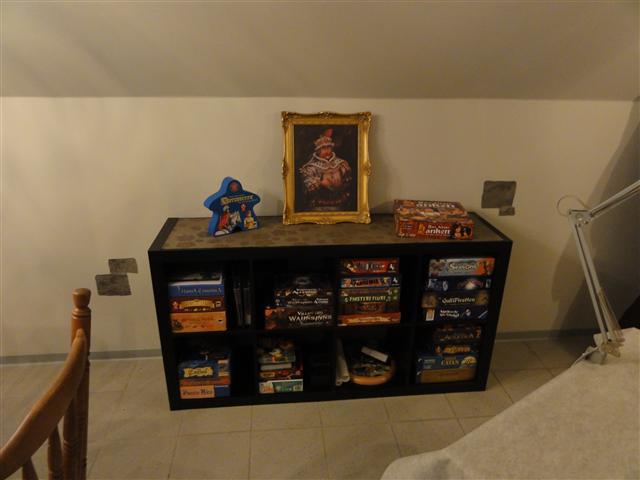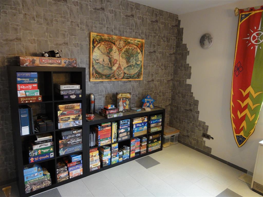Ein Spilezimmer das wär noch mal was, da mein liebster Raum in unserer Wohnung eh die Wohnküche ist, verbringe ich dort die meiste Zeit. So kann meine Freundin das Wohnzimmer haben und sich dort frei entfalten. In den anderen Räumen speziell im Schlafzimmer dürfen auch keine Spiele gestapelt werden. Reichen die Regale nicht mehr aus, wird halt verkauft.