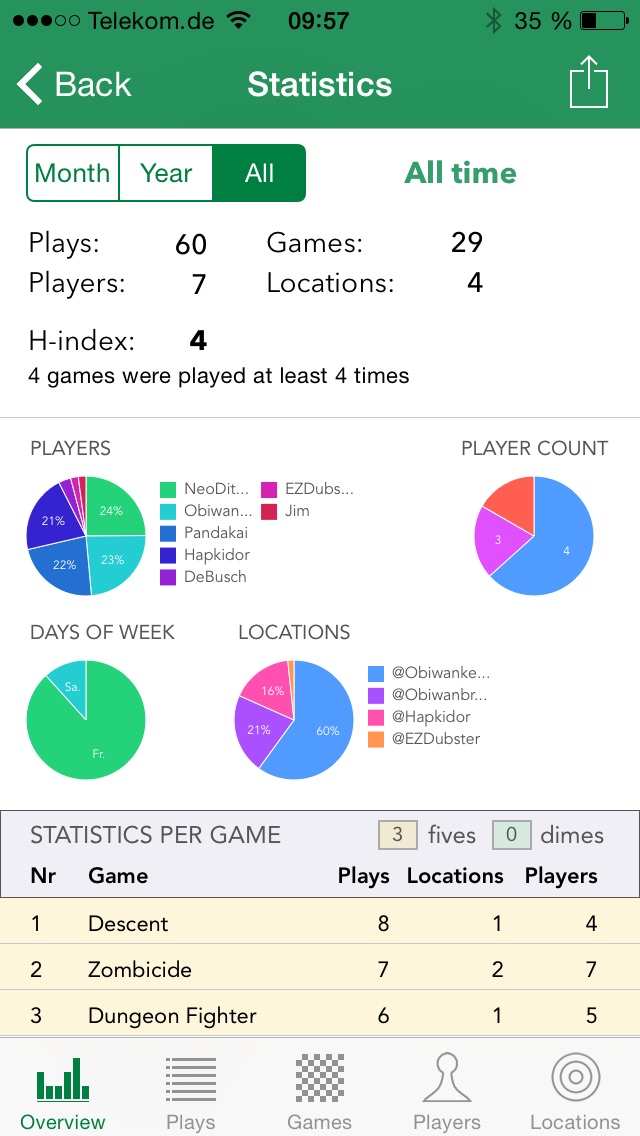 Hier gibt's die ultimative Lösung - die App Board Game Stats! Wer Spielstatistiken erstellt oder einfach nur gerne Sieger notieren möchte sollte sich unbedingt diese App mal anschauen. Sie ist mit der Datenbank von BGG verknüpft und kann dort zugreifen inklusive Anlage neuer Spiele(Runden). Die Statistiken und Grafiken sind einfach nur genial! Wie viele Spiele habe ich bei Starcraft gewonnen? Wie viel Prozent Anteil sind das? Haben wir öfter zu viert oder zu fünft gespielt? Wer hat mitgespielt? Wie viele Punkte hatte jeder? Top Punktzahl ever? Wird hier alles beantwortet.