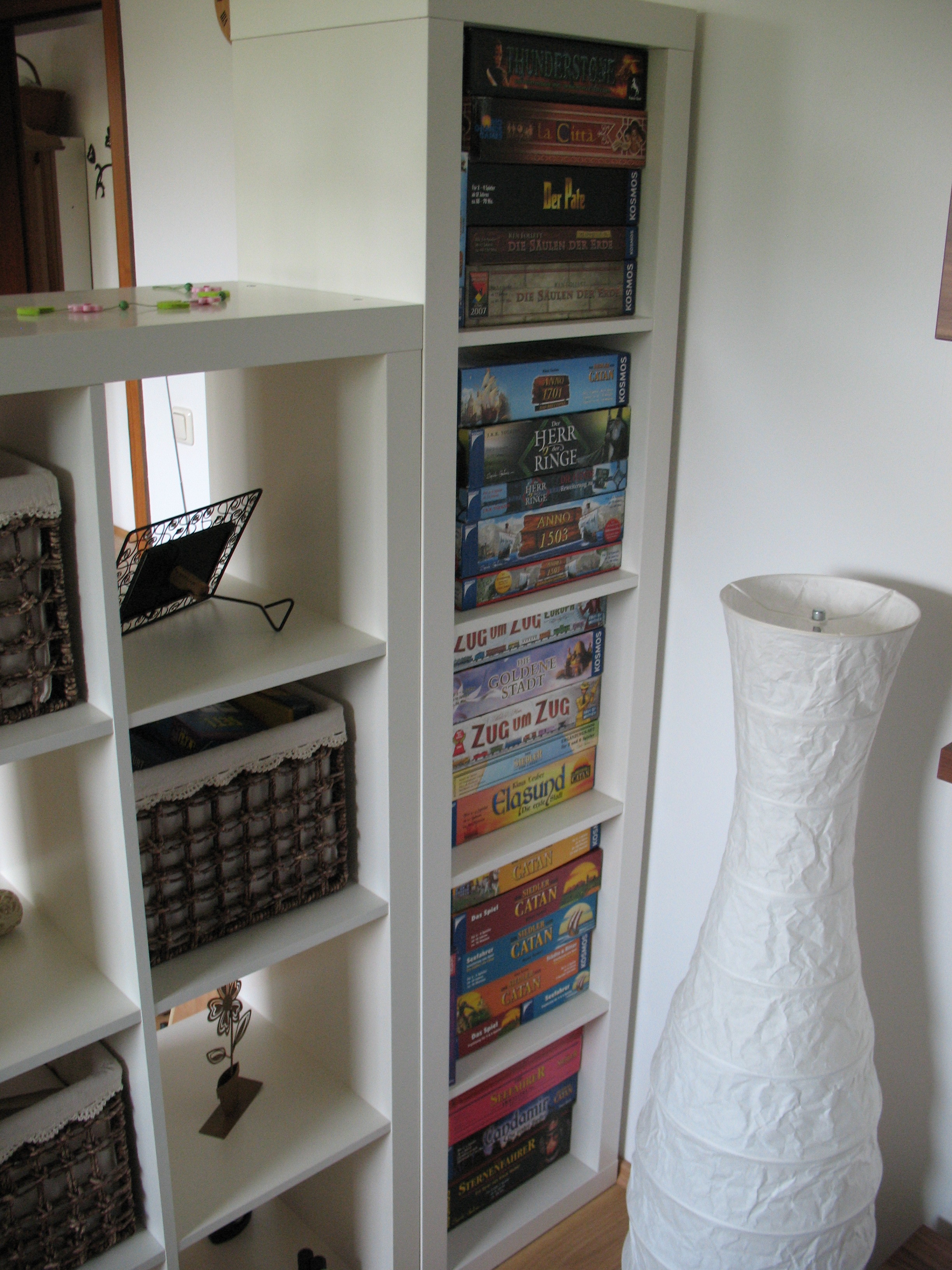 Nach dem großen Ausmisten gestern hab ich jetzt endlich alle Spiele in einem Regal! Die Kartenspiele liegen momentan noch auf dem Tisch daneben, kommen aber noch in eine der Schubladen. Ganz zufrieden bin ich mit der Anordnung noch nicht, aber im Großen und Ganzen passt es. Ganz oben muss auch nochmal ausgemistet werden, aber kommt Zeit...